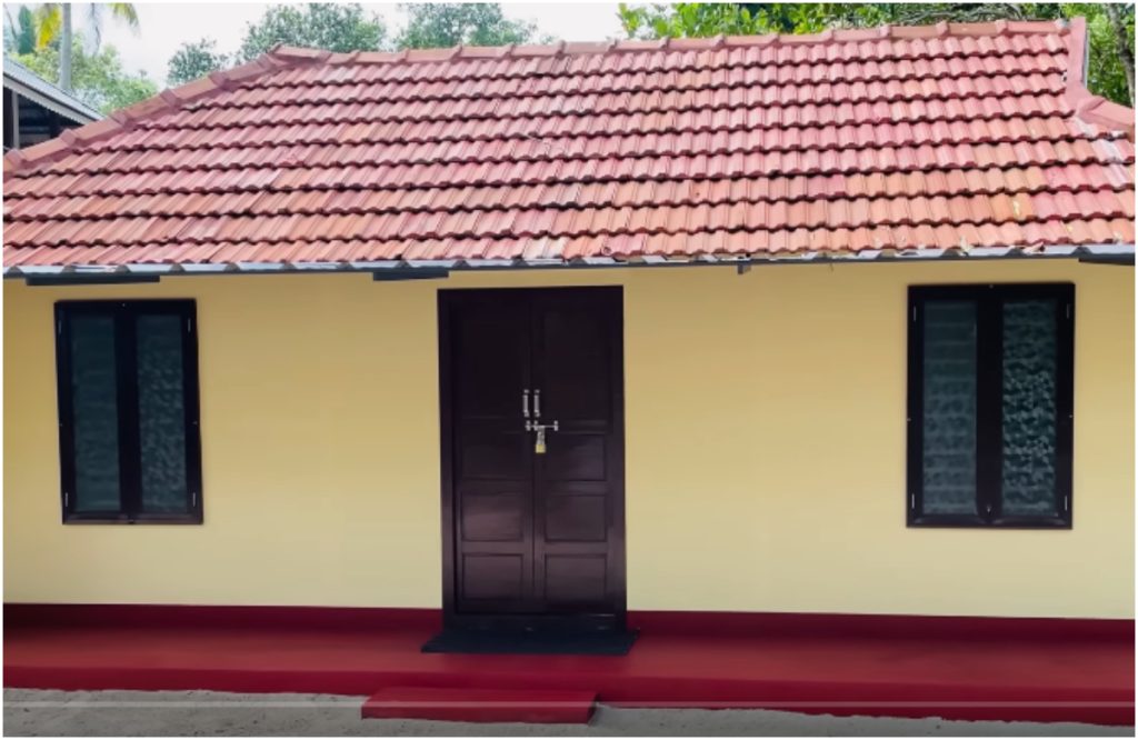 സ്ഥിതി ചെയ്യുന്നത്. വെറും രണ്ടരലക്ഷം രൂപയാണ് ഈ വീടിന്റെ നിർമ്മാണ ചിലവ്. സിമന്റ് ഇരുമ്പ് ഡ്രസ്സ് ചെയ്തു ഓട് മേഞ്ഞ നിലയിലാണ് ഇതിന്റെ മേൽക്കൂര. വീതി കുറഞ്ഞു നീളത്തിലുള്ള ഒരു കൊച്ചു തിണ്ണയാണ് വീടിനുള്ളത. വി ബോർഡ് ഉപയോഗിച്ചാണ് വീടിന്റെ ഭിത്തികൾ പണിതിരിക്കുന്നത്. അകത്തേക്ക് കടന്നാൽ വിശാലമായ ഒരു ഹാൾ ആണുള്ളത്. ടീവി യൂണിറ്റും അവിടെ തന്നെയാണ്. ഡൈനിങ് ഏരിയയും ലിവിങ് ഏരിയയും ഹാളിൽ സെറ്റ് ചെയ്തിട്ടുണ്ട്. ഒരു ദിവാൻ കോട്ടും കസേരകളുമാണ്